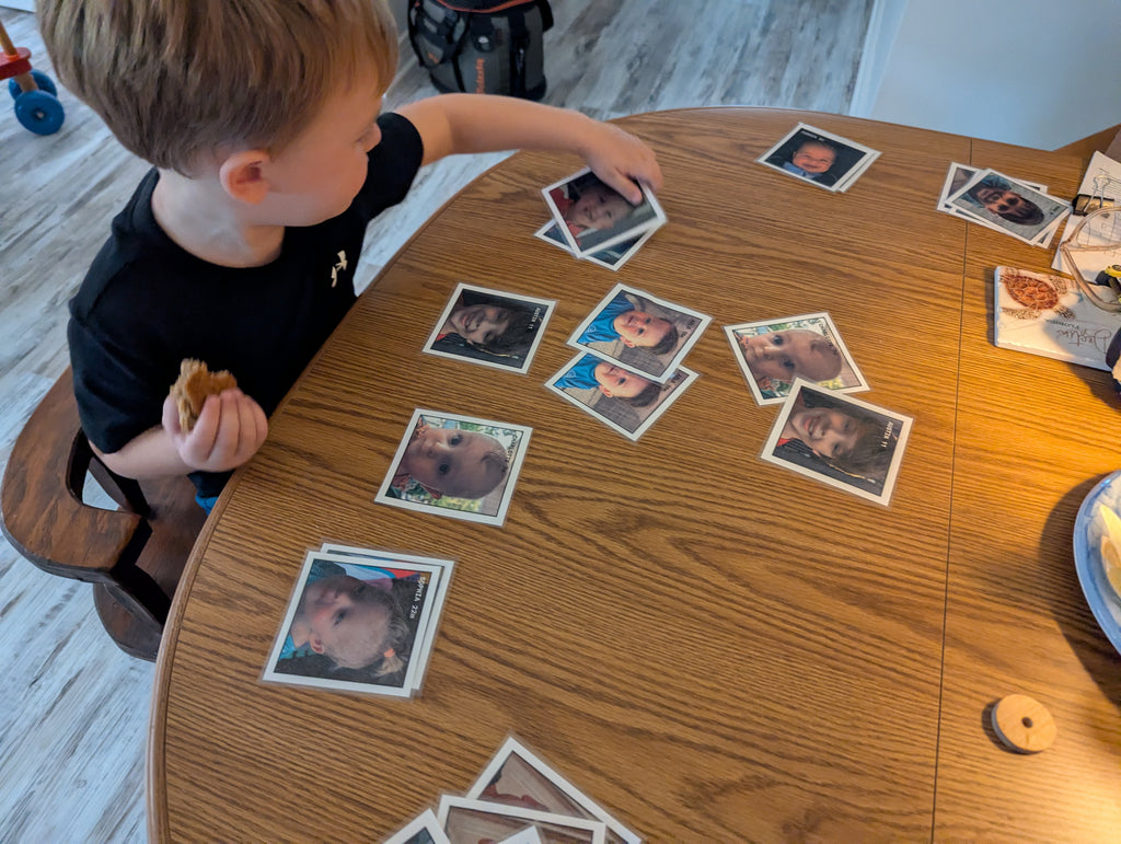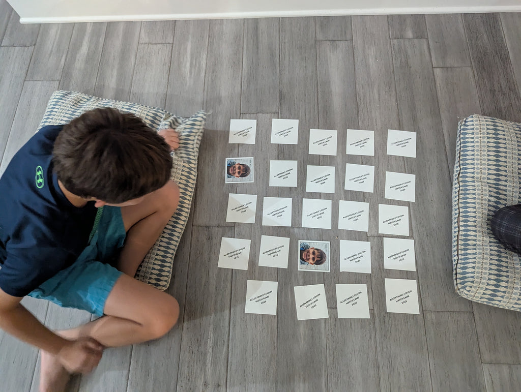 You will receive 2 coated playing cards of each photo for a total of 28 cards, with a title of the card game of your choice: IE: ALLEN FAMILY COUSIN MEMORY-MATCH GAME 2025 or like this other one pictured for grandpa: DENNIS AROUND THE WORLD...In His Golden Years!